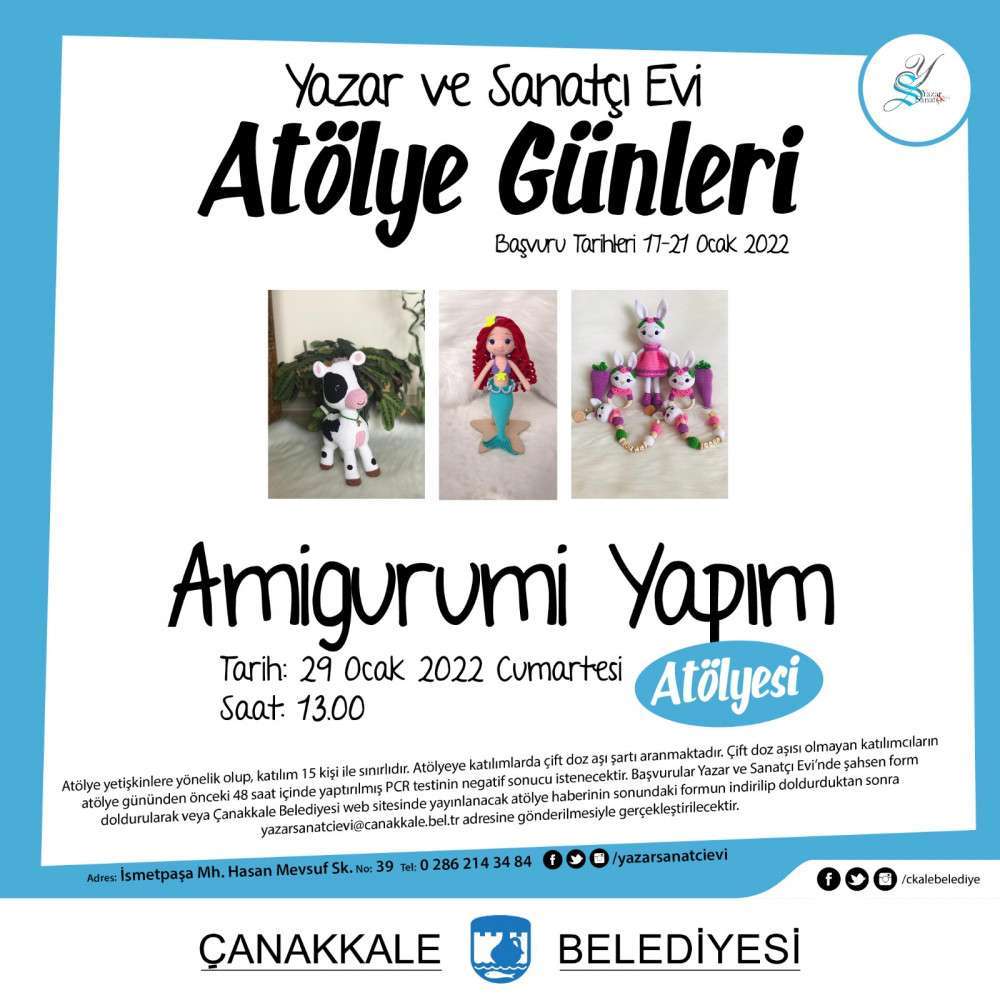 Çanakkale Belediyesi 2022 Ocak Ayı Kültür Etkinlikleri kapsamında; Yazar ve Sanatçı Evi’nde Amigurumi Yapım Atölyesi gerçekleştirilecek. Atölye 29 Ocak Cumartesi günü saat 13.00’te katılımcılar ile buluşacak.