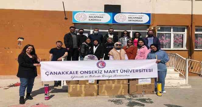 ÇOMÜ'lü gençler Akçapınar Ortaokulu'nda eğitim gören miniklere kitap, kırtasiye ve giysi desteği sağladı.