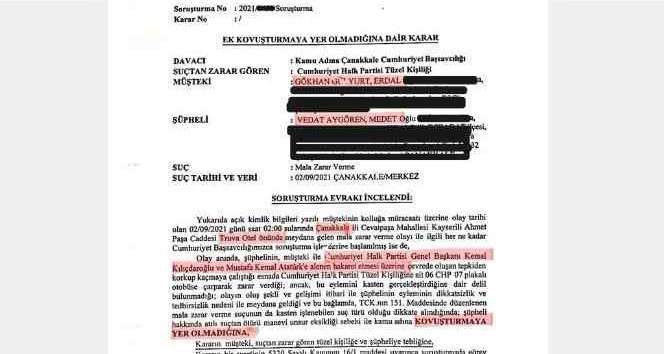 Aynı gece Çanakkaleli Vedat Aygören'in CHP Genel Başkanı Kemal Kılıçdaroğlu'na hakaret ettiği iddiasıyla avukatlar aracılığı ile Çanakkale Cumhuriyet Başsavcılığına şikayette bulunulmuştu. Otobüs şoförü G.G. ile CHP İl Kadın Kolları Başkanı Sibel Erol'un ifadelerinde Vedat Aygören'in Kılıçdaroğlu'na hakaret etmediği ortaya çıktı. Bunun üzerine Cumhuriyet Savcılığı tarafından yapılan açıklamada, “Türk Ceza Kanunu'nun 125. maddesinde düzenlenen gıyapta hakaret suçunun oluşabilmesi için hakaret fiilinin en az 3 kişi ile ihtilat ederek işlenmesi gerektiği, somut olayda söz konusu ihtilat unsurunun gerçekleşmediği anlaşılmakla, şüpheli hakkında kovuşturma yapılmasına yer olmadığına karar verilmiştir” denildi.